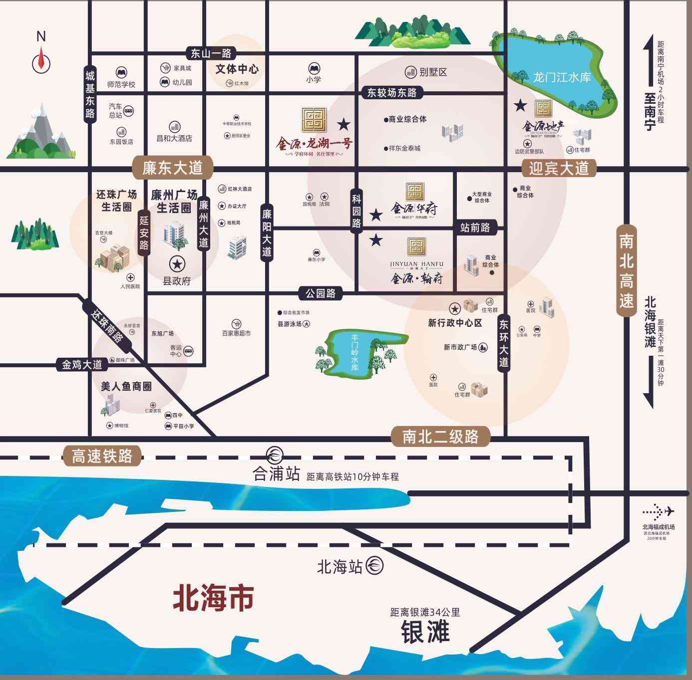 【金源龙湖一号】位于科园路9号,项目地处城东新区,附近有商业购物中心、综合批发市场、交通便利;项目的南北两侧,分别是合浦县城内仅有的两个自然水库——龙门江水库和丰门岭水库。