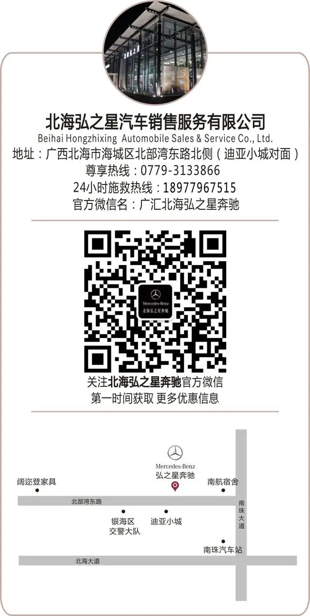 广汇北海弘之星,您身边的专属奔驰管家。广西北部湾地区首个汽车豪华品牌4S店,我们致力于将奔驰汽车及其国际化标准的“星徽”服务引入北部湾。星徽热线:0779-3133866