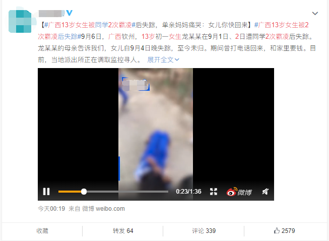 近日,有媒体报道广西钦州某中学一初一年级女生遭另外三名女生连续两次霸凌。报道称,该女生的母亲表示,孩子于9月1日遭掌掴后,于9月2日又被三名女生拳脚相加。 荔枝新闻注意到,霸凌事件发生后,当地教育局于9月5日发布情况通报,称已对三名打人学生进行了训诫,并由学生和其家长出具保证书,保证不再有类似事件发生,被打女孩情绪平稳。然而9月7日,被打女孩的母亲在接受媒体采访时称,自己的孩子已失踪两天,期间曾经打电话给自己要钱。媒体报道称,孩子母亲哭诉:“孩子你快回来。”