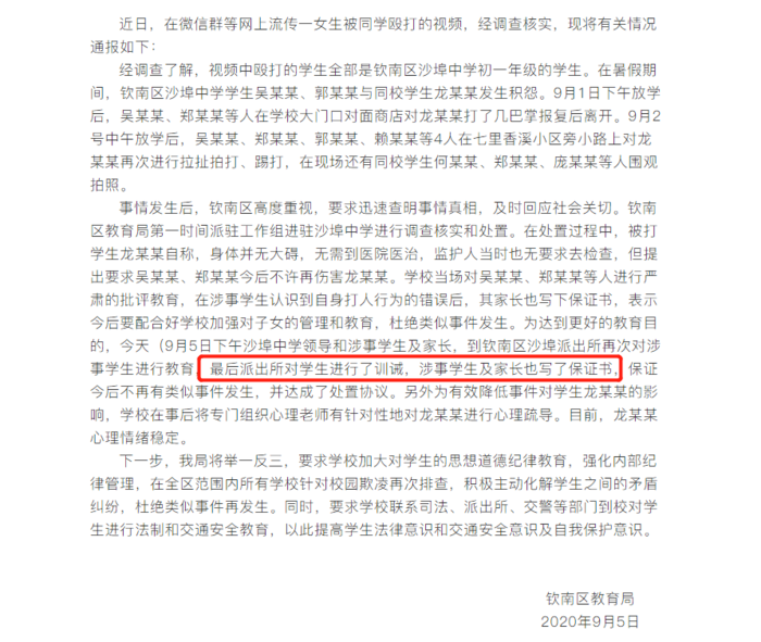 据陈副局长介绍,事实上这名被打的女生和另外三名打人的学生日常生活中是朋友,当天因矛盾大打出手,并不是单纯的校园霸凌。“几个女孩平时在学习中都有一些问题,家长也都比较头疼,管不了。”他表示,被打的同学因为是留守儿童,由外婆带着生活,母亲离异后则在外打工,平时也有被外婆打的情况,事发后,因为怕被打,才去了同学家,导致了上述误会产生。 他告诉荔枝新闻,事后教育局和学校出面处理此事,打人孩子的家长主动把给女孩到医院检查的钱加到了2000元,不过因为被打的孩子睡过头,目前还没有去检查。“后来我们当地的领导都亲自到孩子家里看望过了,孩子情绪确实比较平稳。通过这个事情的话,我们也想让双方家长意识到,教育问题不能全依赖学校,也看清楚,我们假如现在不及时教育的话,可能下一步会出现更严重的事情,家长也认可了。”(荔枝新闻)