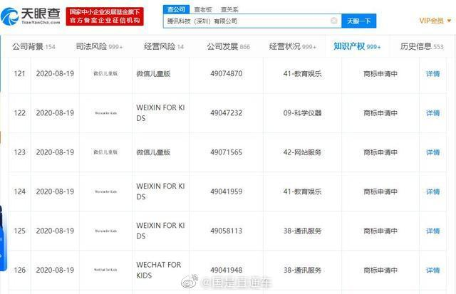 天眼查数据显示,近日,腾讯科技(深圳)有限公司新增多条商标信息,其中包括多条“微信儿童版”、“WEIXIN FOR KIDS”的商标,商标状态均显示为“商标申请中”。涉及国际分类包括教育娱乐、科学仪器、网站服务等。 ​​​​