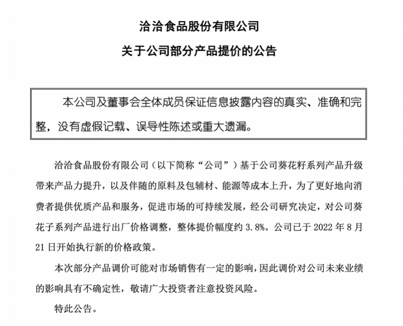 8月23日下午,洽洽食品(002557.SZ)发布公告称,基于公司葵花籽系列产品升级带来产品力提升,以及伴随的原料及包辅材、能源等成本上升,为了更好地向消费者提供优质产品和服务,促进市场的可持续发展,对公司葵花子系列产品进行出厂价格调整,整体提价幅度约3.8%。
