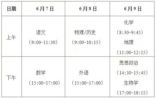 一般安排在6月7日—9日进行,时间由改革前的2天调整为改革后的3天。全国统考科目考试时长与改革前相同:语文科目考试时长为150分钟,数学、外语科目考试时长均为120分钟;每门选择性考试科目考试时长均为75分钟。