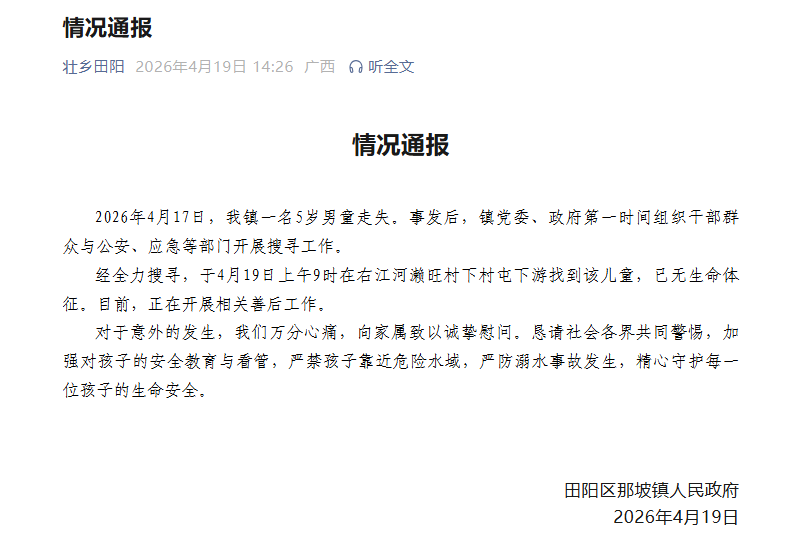 近日,广西百色市田阳区一名5岁男童走失,引发网友关注。19日下午,田阳区那坡镇政府发布情况通报称,该儿童于19日上午被找到,已无生命体征。 通报全文如下—— 4月17日,我镇一名5岁男童走失。事发后,镇党委、政府第一时间组织干部群众与公安、应急等部门开展搜寻工作。 经全力搜寻,于4月19日上午9时在右江河濑旺村下村屯下游找到该儿童,已无生命体征。目前,正在开展相关善后工作。 田阳区那坡镇政府称,对于意外的发生,我们万分心痛,向家属致以诚挚慰问。恳请社会各界共同警惕,加强对孩子的安全教育与看管,严禁孩子靠近危险水域,严防溺水事故发生,精心守护每一位孩子的生命安全。  称广西百色一名5岁男童走失,家属盼好心人提供线索。